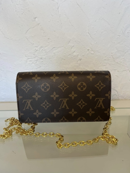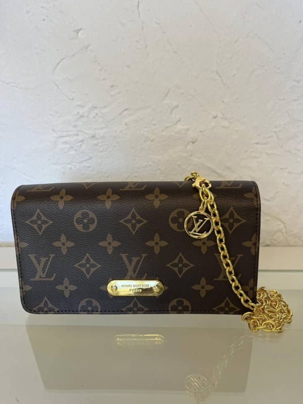 This Lily chain wallet in Monogram canvas combines a sleek rectangular silhouette with a slightly retro look. Its flap features a gold-tone plaque adorned with rivets and engraved with the signature. Spacious enough to hold daytime and evening essentials, it offers multiple carrying options thanks to its removable and adjustable chain embellished with a charm.