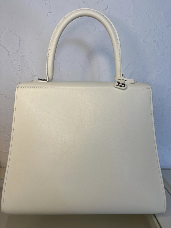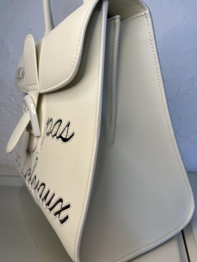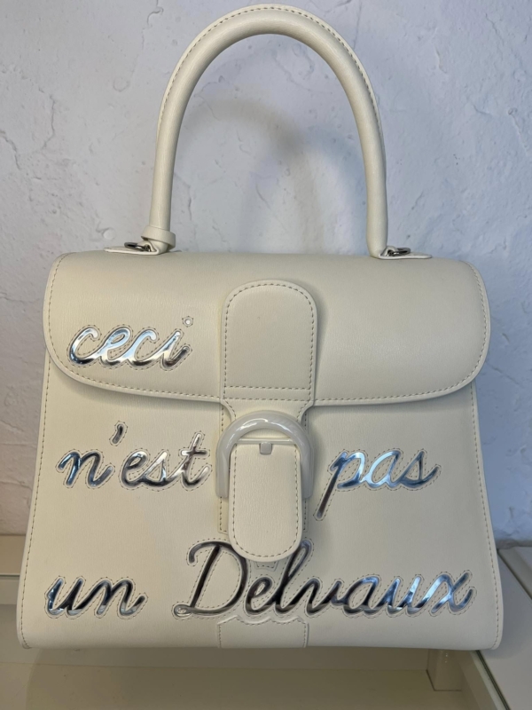 A “Brillant” bag adorned with the motto “Ceci n’est pas un Delvaux.” Available in size MM and in an elegant ivory tone, it features almost translucent lettering. The purity of its style and its luminous skin are inimitable. This bag is TQ.