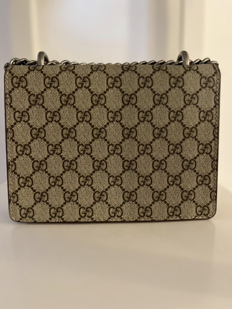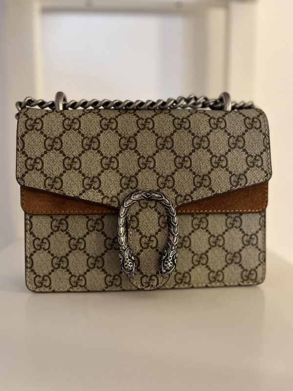 The antique silver-tone tiger clasp on this bag is inspired by Greek mythology. This shoulder style is made from monogrammede coated-canvas trimmed with suede and has a slising chain strap to alter how you carry it.