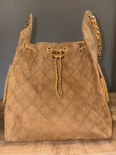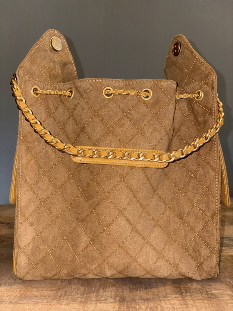 This Medium 25 Hobo Bag is in camel suede leather with antique gold hardware, features signature diamond quilt, two exterior side pockets, drawstring closure, a removable pouch, and a single interwoven antique gold and Black leather shoulder strap.