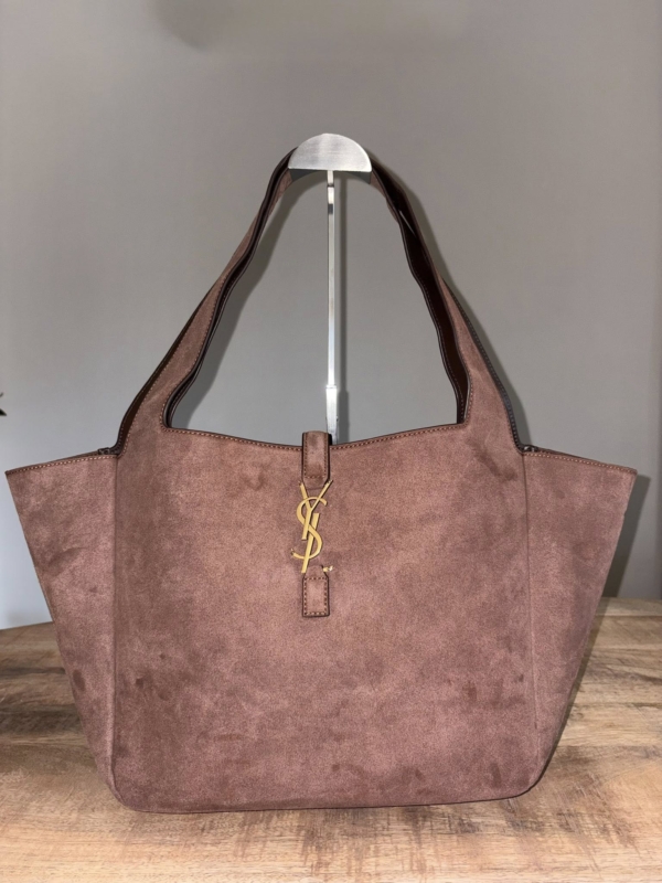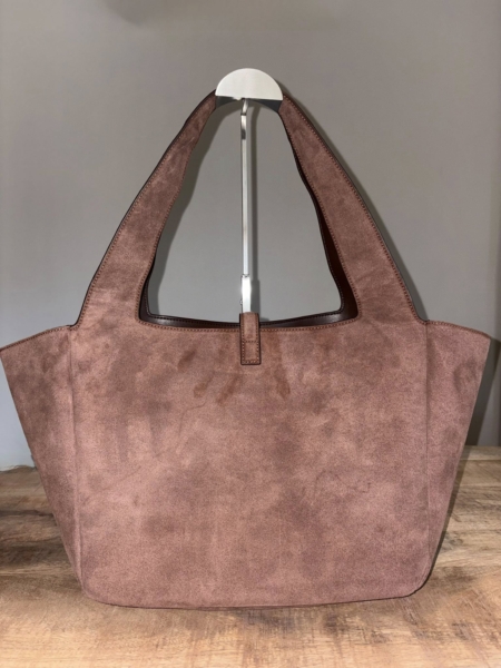 Flexible suede tote bag. This lightweight bag, fully lined in tone-on-tone suede, features an interior zip pocket and a leather pull tab closure adorned with the Cassandre logo.