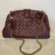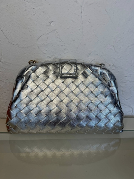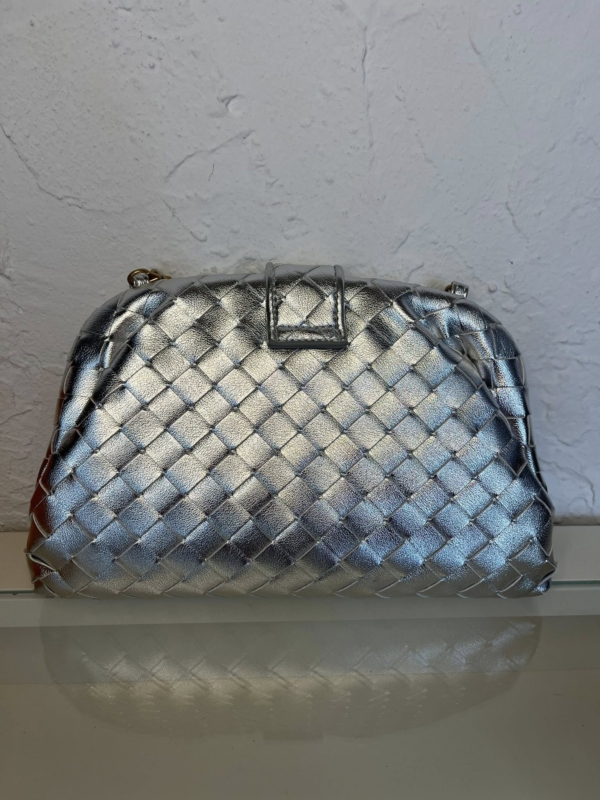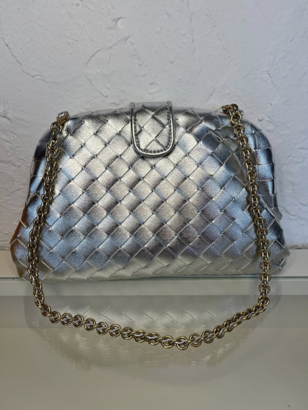HQ Lauren 1980 clutch in padded Intrecciato leather with tubular leather braided metal chain. The bag has one single compartment. It has a magnetic flap closure.