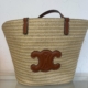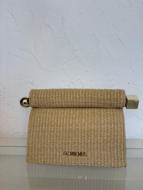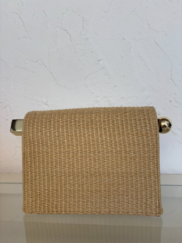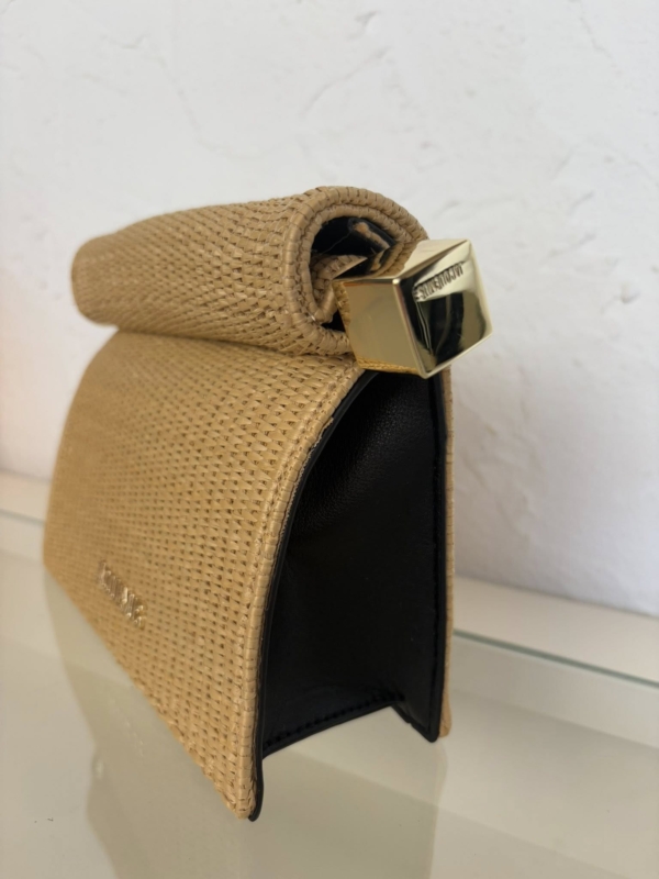 This HQ clutch is made of woven raffia. It rolls open to get access to the inside of the clutch. It has a large gold metal circle and square closure endings.