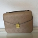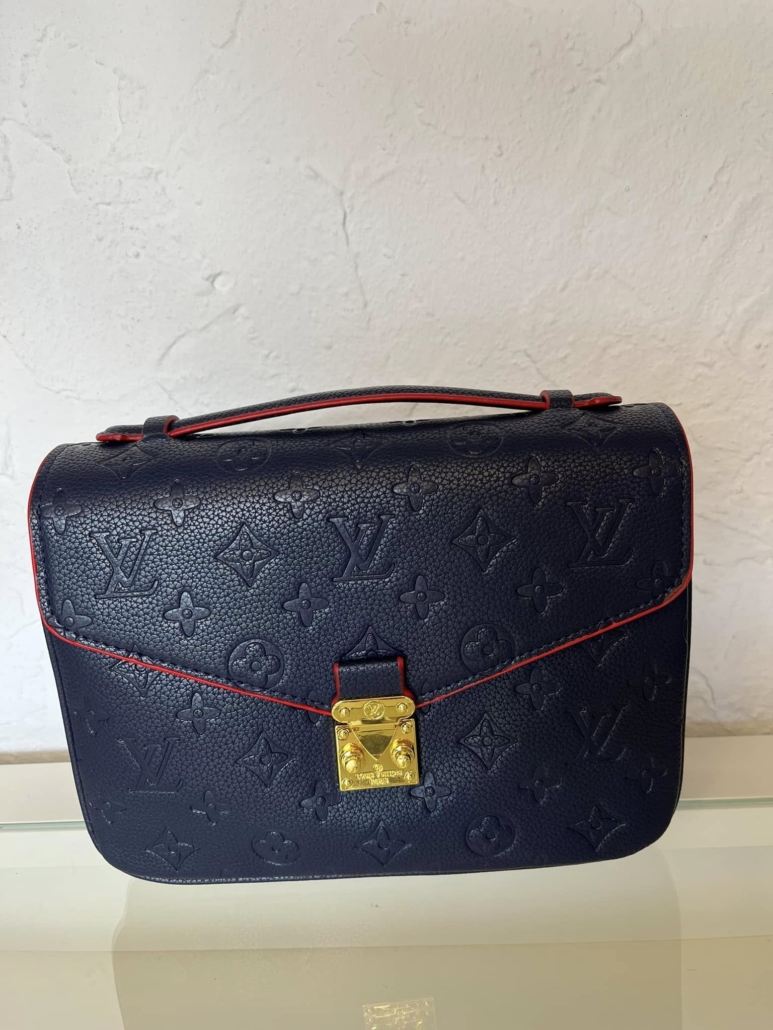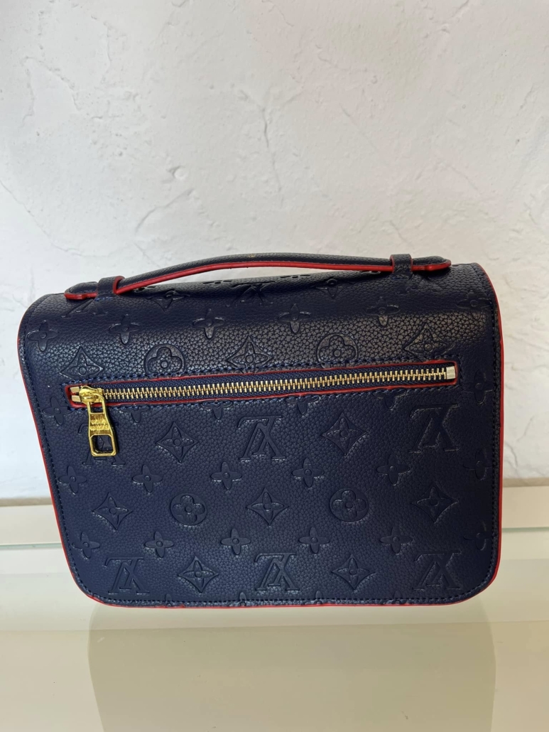 The Pochette Metis MM in Monogram Empreinte marine blue and red is a shoulder bag made of navy red leather. It measures 19 cm in height, 25 cm in width, and 7 cm in depth, making it a compact yet stylish accessory. It comes with a shoulder strap and can easily be worn by hand.