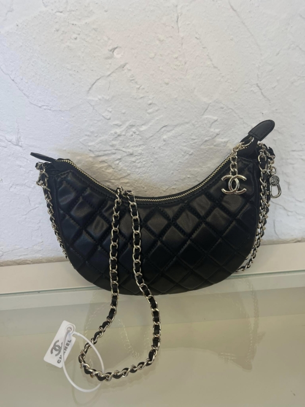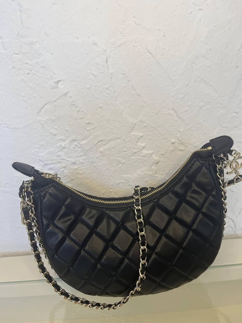 This is an authentic general leather Quilted Chain Around Hobo in Pink. This chic classic shoulder bag is composed of fine diamond quilted leather. This bag features leather threaded gold chain link trim that extends to the leather top handle and a gold CC logo on the front. The top zipper opens to a matching fabric interior with a patch pocket.
