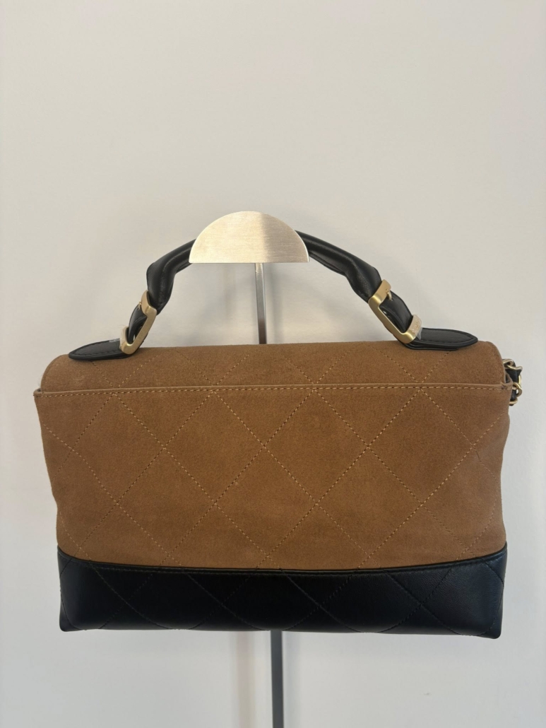 This Coco Base Top Handle Flap Bag is in brown suede and black shiny lambskin with brushed gold hardware, featuring featuring suede calfskin leather with a quilted shiny lambskin leather base, front flap CC turnlock closure, a leather top handle, and a single Interwoven brushed gold tone and black leather shoulder strap.