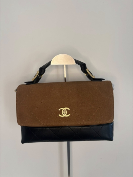 Top Quality Base Top Handle Flap Bag Brown Suede and Black Shiny Lambskin