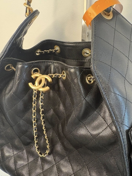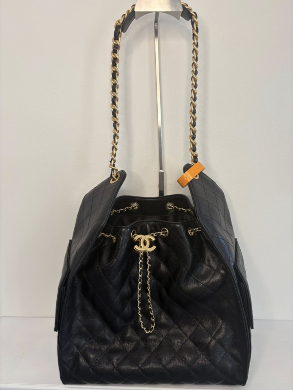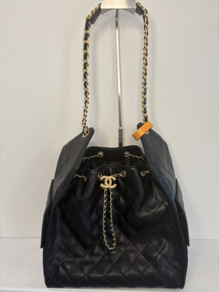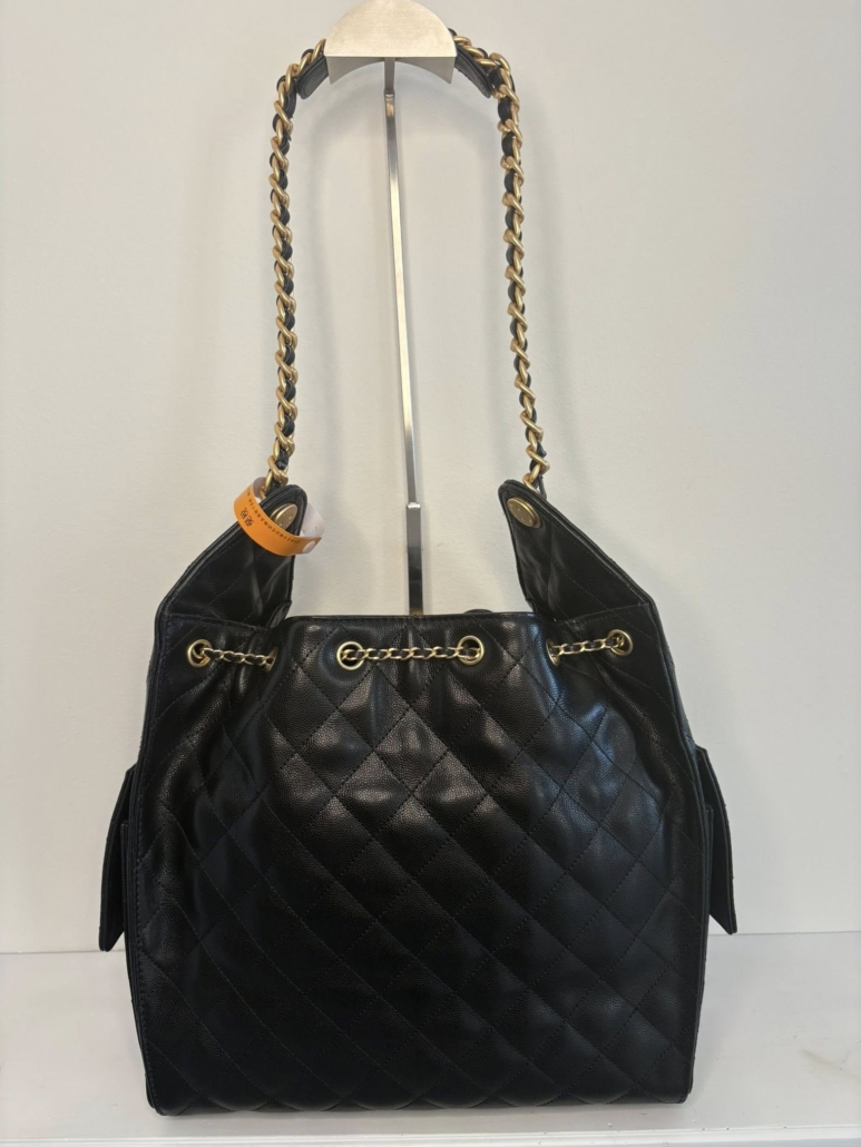 This Large 25 Hobo Bag is in black caviar leather with antique gold hardware, features signature diamond quilt, two exterior side pockets, drawstring closure, a removable pouch, and a single interwoven antique gold and Black leather shoulder strap.